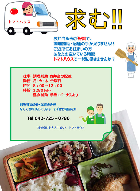 | 作業内容: | 厨房(お弁当作成、仕込み、製菓作成、清掃) 喫茶(配達、接客) |